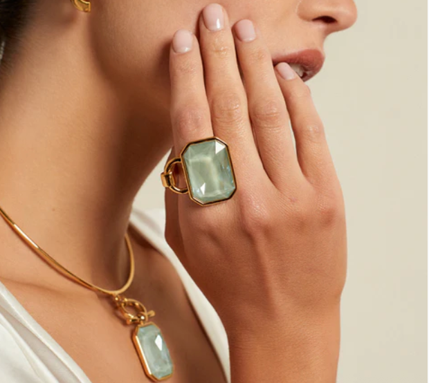 Anillo de Latón bañado en Oro con piedra Swarovski color agave