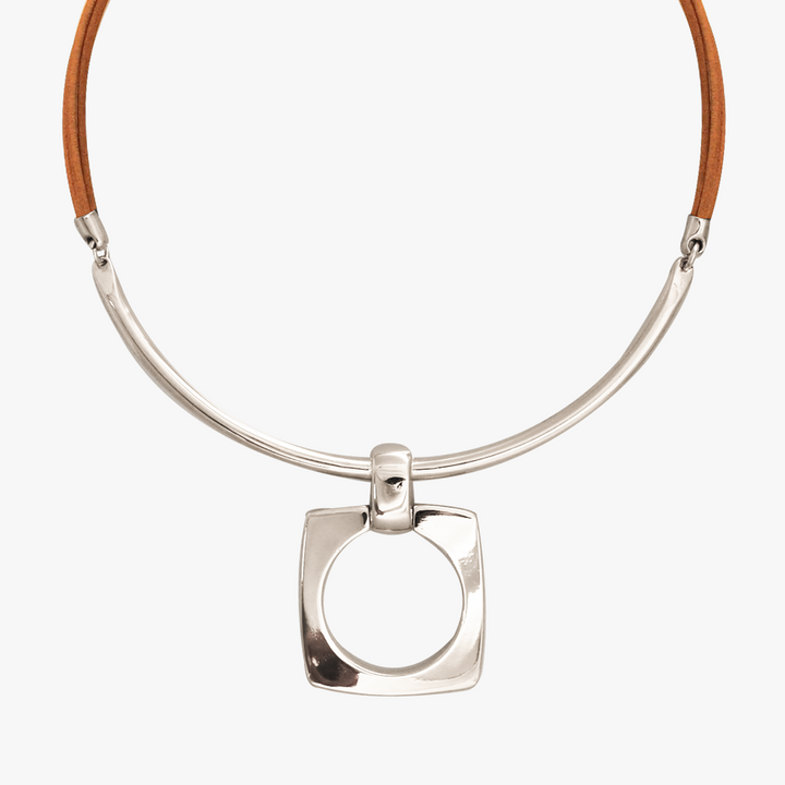 Gargantilla de cuero y aplique metálico bañada en Plata. Talla: ajustable al cuello de 35,5 a 62,5 cm con aplique de 3,8 x 5 cm.