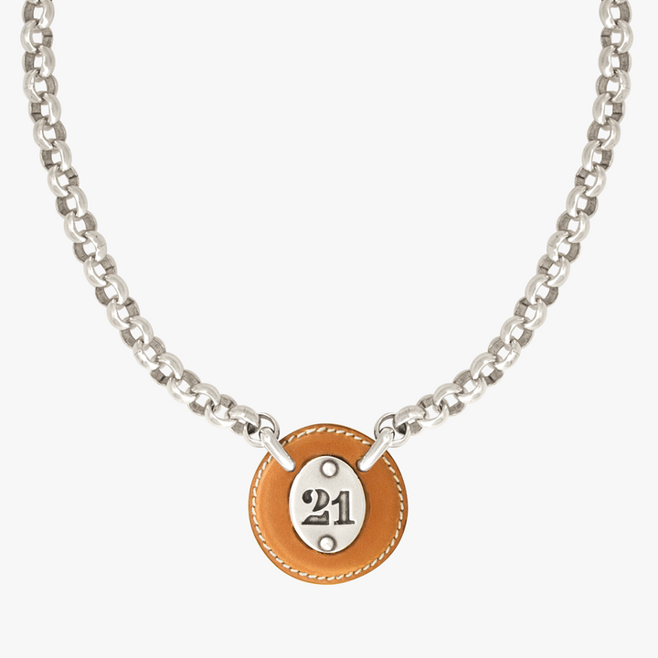 Collar bañado en Plata con chapa 21 forrada en cuero. Talla ajustable desde 32 a 50 cm. Peso: 93,3 gr.