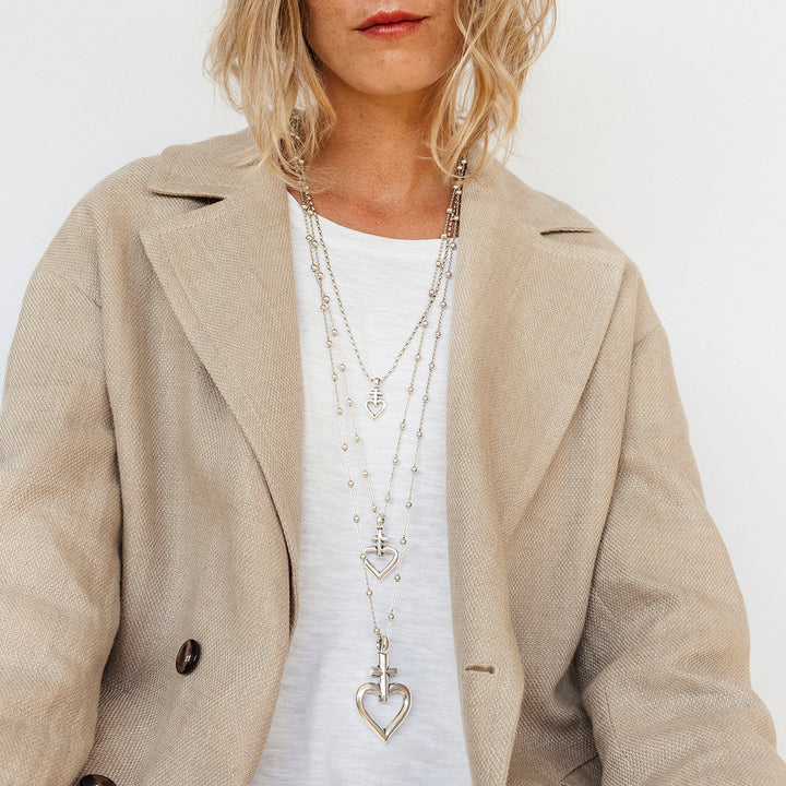 Los colgantes son tendencia, por eso traemos este diseño de largo medio para quienes buscan una nueva pieza para su colección. La joya está producida con una aleación de metales y latón y bañada en plata. Diseño exclusivo de CXC, elaborado de manera artesanal en España.