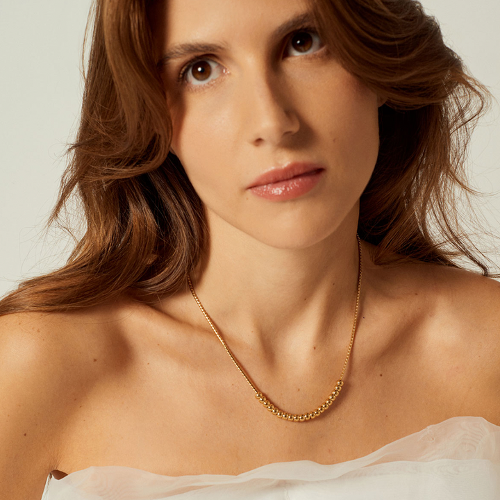 Collar con abalorios de bola bañados en Oro.Talla: ajustable al cuello de 38 a 50 cm. Peso Aprox. : 14,4 gr.