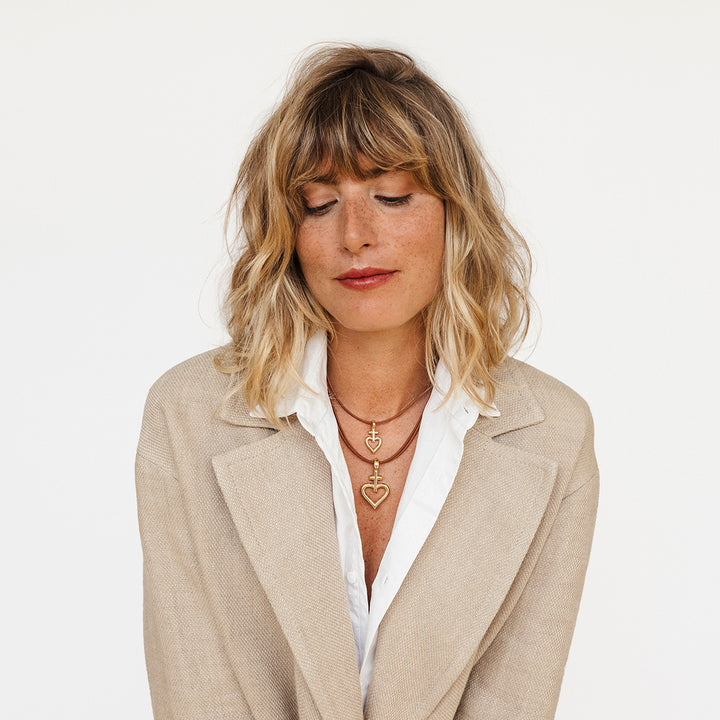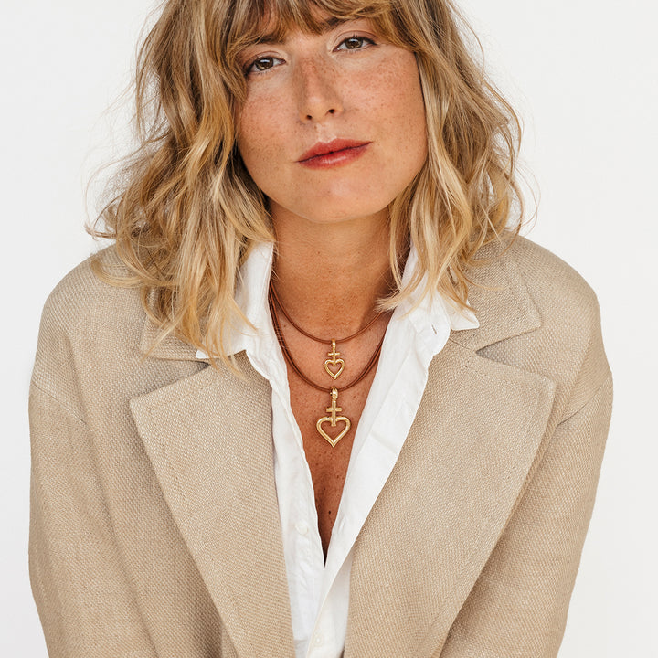 Collar con dos hilos de cuero, lleva unos terminales y una cadena extensora de 10 cm bañada en oro. Motivo corazón bañado en oro.