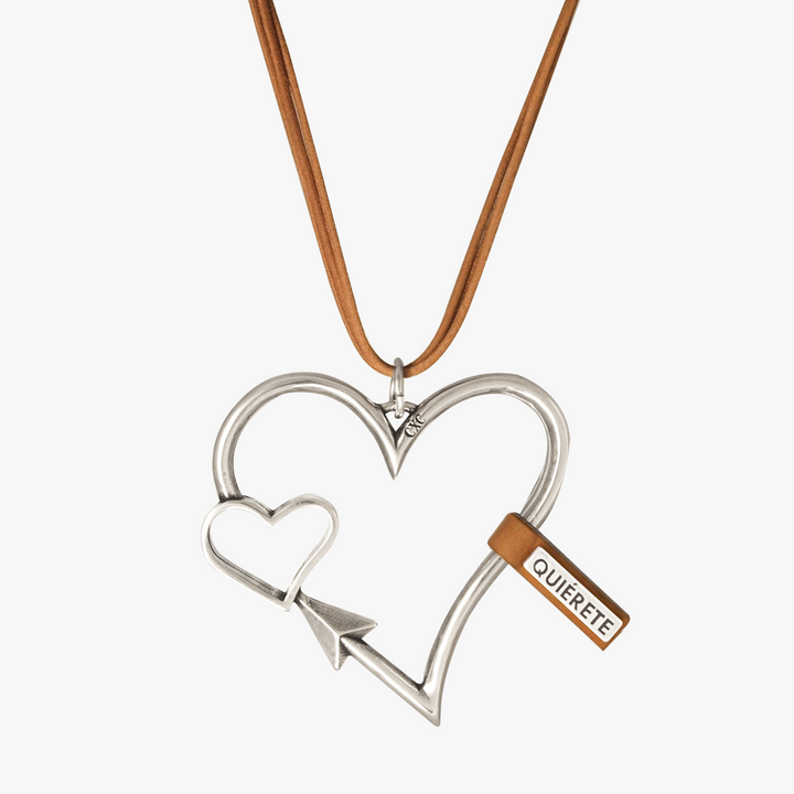 Collar bañado en Plata motivo corazón con cordón de cuero.Talla: ajustable al cuello de 92 a 104 cm con, abalorio de 5 cm. Peso Aprox. : 56,6 gr.