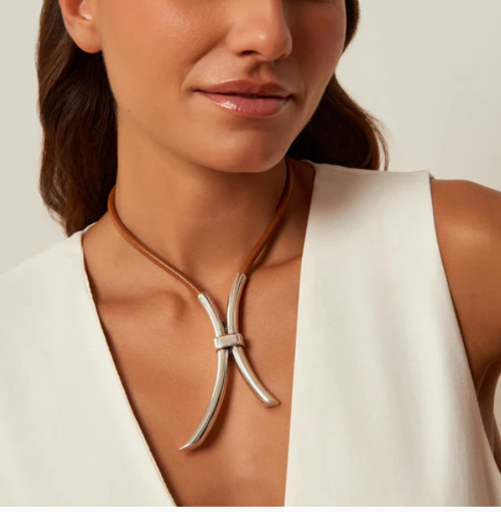 Collar Desvío Cuero, una pieza única que combina la suavidad del cuero con un diseño audaz y moderno. Ideal para quienes buscan un toque de originalidad y sofisticación, este collar es perfecto para realzar cualquier look con un aire de elegancia desenfadada.