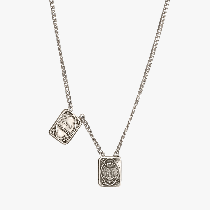 Collar bañado en Plata. Talla: ajustable al cuello de 37 a 53,5 cm con escapularios de 1,5 x 1,8 cm. Peso : 19,2 gr.