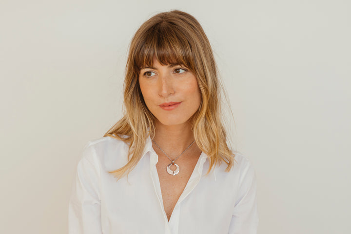 Collar bañado en plata de una longitud de 47 cm. El motivo va unido a la cadena mediante una tira de cuero cosido a mano.