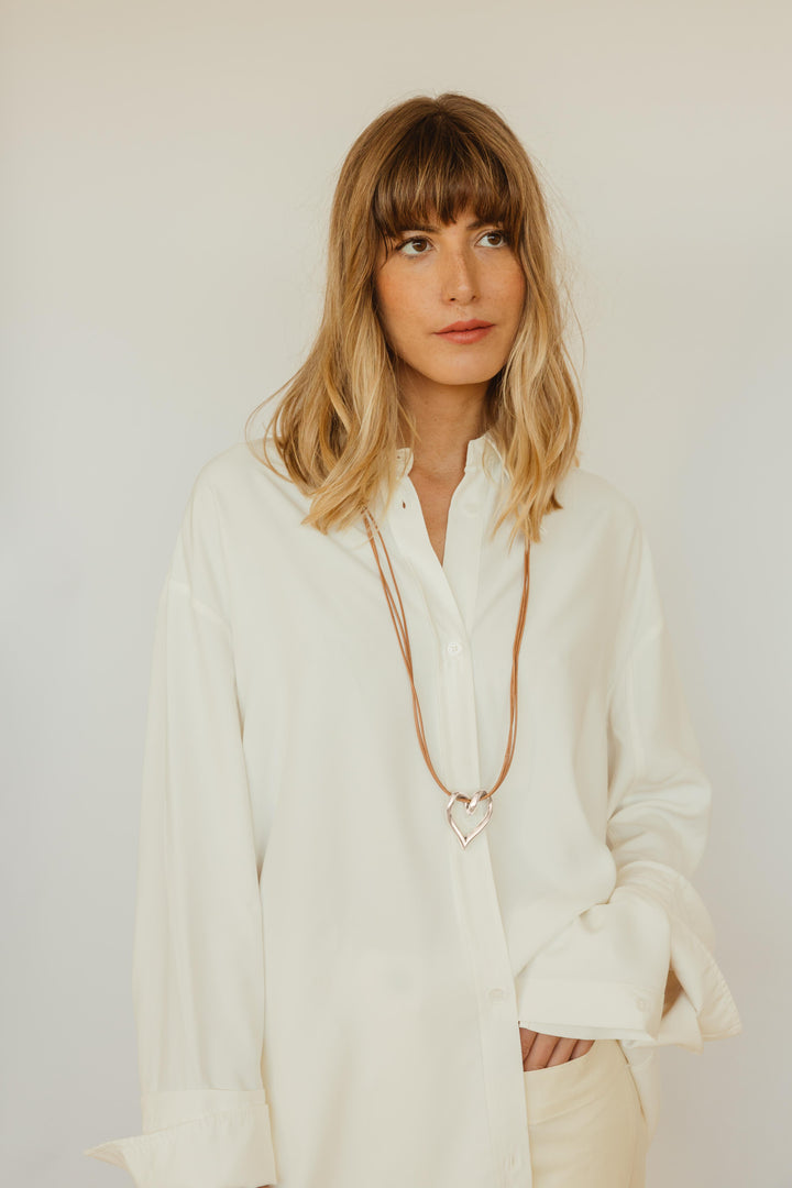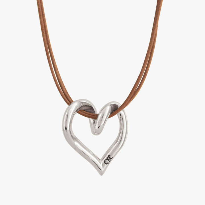 Collar con tres hilos de cuero de 1,6 mm con un largo de un metro, lleva unos terminales y una cadena extensora de 10 cm bañada en Plata.Motivo corazón bañado en Plata.