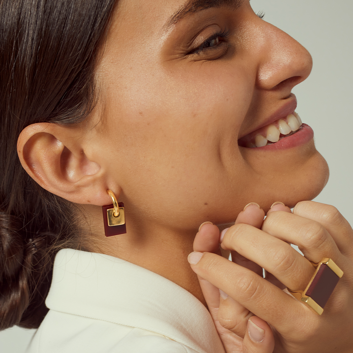 Pendientes bañados en Oro con pieza de metacrilato. Largo desde la base del pincho 2,7 cm. Peso: 3,2 gr.