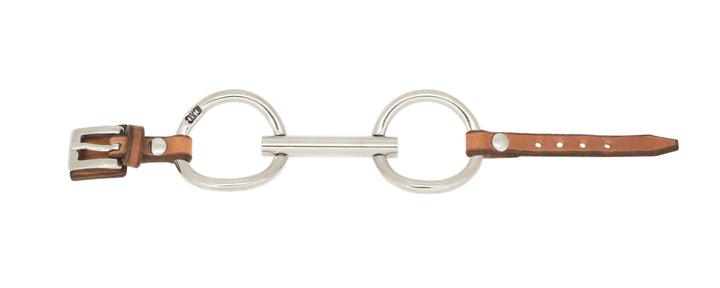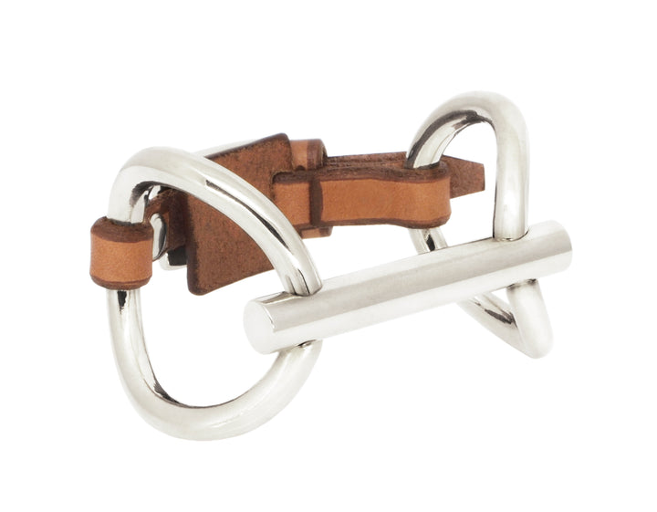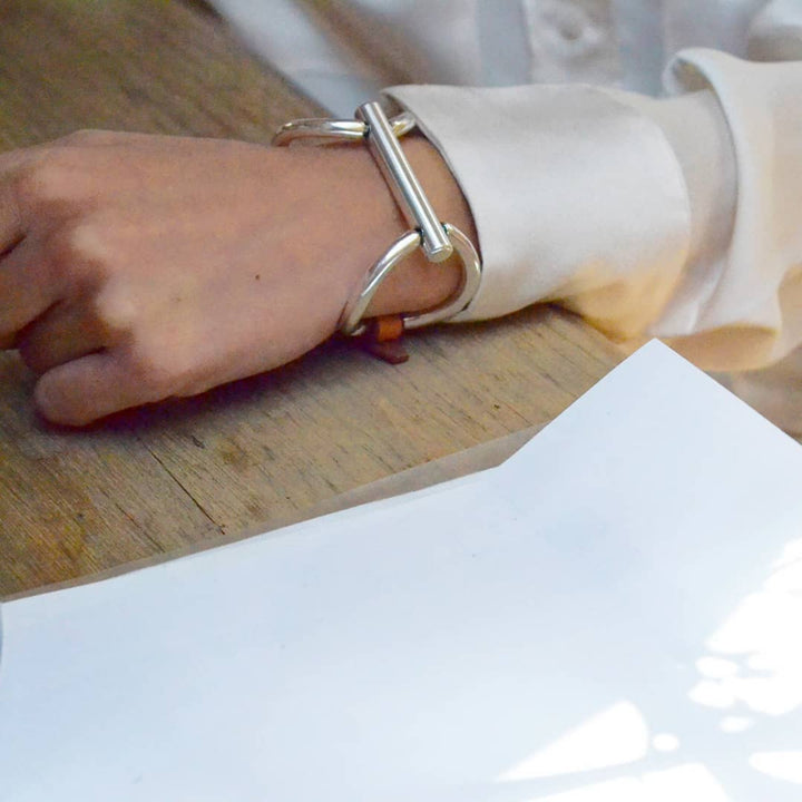 Otra pieza icónica de la firma es este exclusivo brazalete de inspiración ecuestre en forma de bocado, mezcla de cuero camel y una aleación de metales bañados en plata. Diseño exclusivo de CXC, elaborado de manera artesanal en España. En forma de bocado estilizado adaptado por la marca.