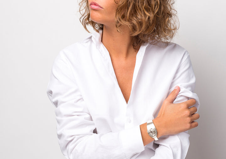 Para quienes buscan una mezcla de lujo y originalidad esta pulsera de metal con cuerpo en forma de boa es ideal. La chapa ha sido cortada y conformada a mano, con soldadura en las bisagras. Modelo bañado en plata. Diseño exclusivo de CXC, elaborado de manera artesanal en España.