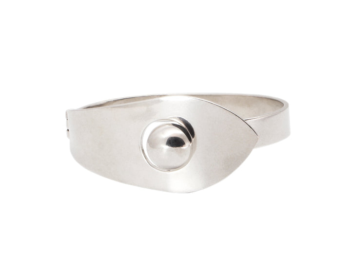 Pulsera rígida en forma de boa con botón en el cierre. El modelo está fabricado en metal y bañado en plata. La chapa ha sido cortada y conformada a mano, con soldadura en las bisagras.