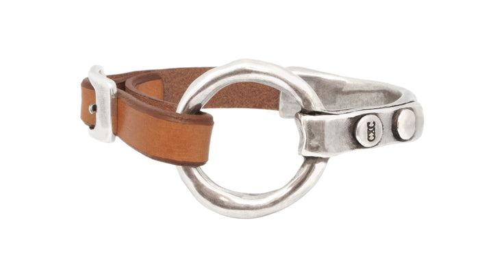 Una mezcla clásica de cuero y metal de inspiración ecuestre. La pulsera está fabricado con una aleación de metales bañado en plata y cuero color camel lujado y fileteado. Diseño exclusivo de CXC elaborado de manera artesanal en España.