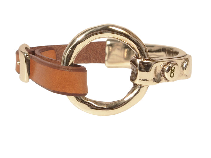 Una mezcla clásica de cuero y metal de inspiración ecuestre. La pulsera está fabricado con una aleación de metales bañado en oro y cuero color camel lujado y fileteado. Diseño exclusivo de CXC elaborado de manera artesanal en España.