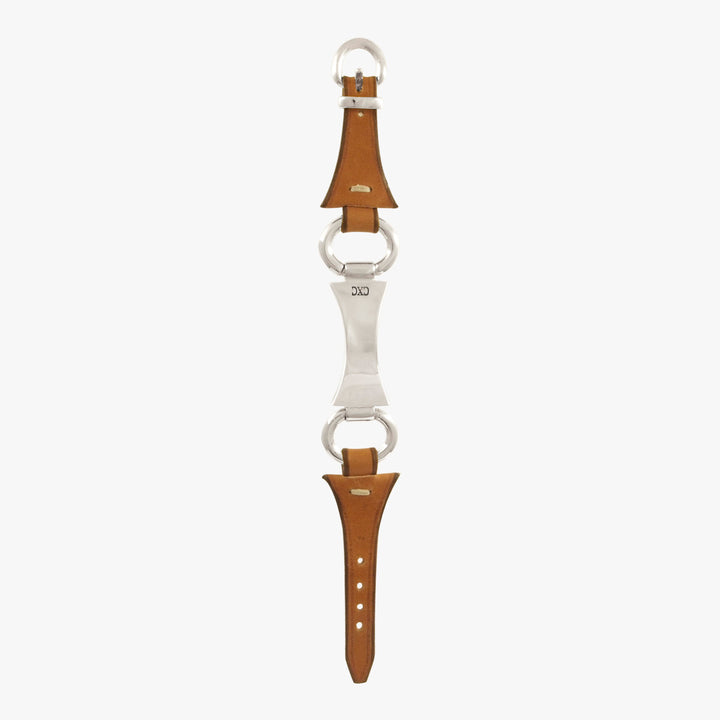 Pulsera Bañada en Plata, Cuero camel de curtido vegetal con canto matado, pintado y fileteado a mano y con costura también hecha manualmente. Esta pulsera de talla única y regulable, es recomendable para muñecas desde 15 cm a 18 cm.
