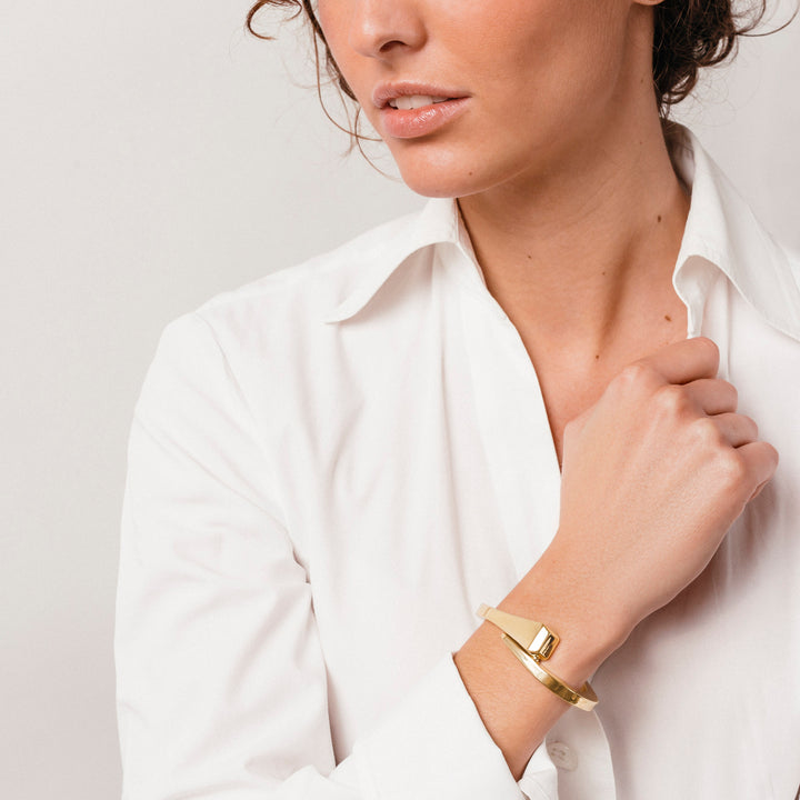 Y poniente nos trae innovadores diseños, como este elegante brazalete, nueva versión del tradicional clavo, pero con aires mucho más refinados. La pulsera está hecha en aleaciones de metales y bañada en oro. Disponible también en oro. Diseño exclusivo de CXC, elaborado de manera artesanal en España.