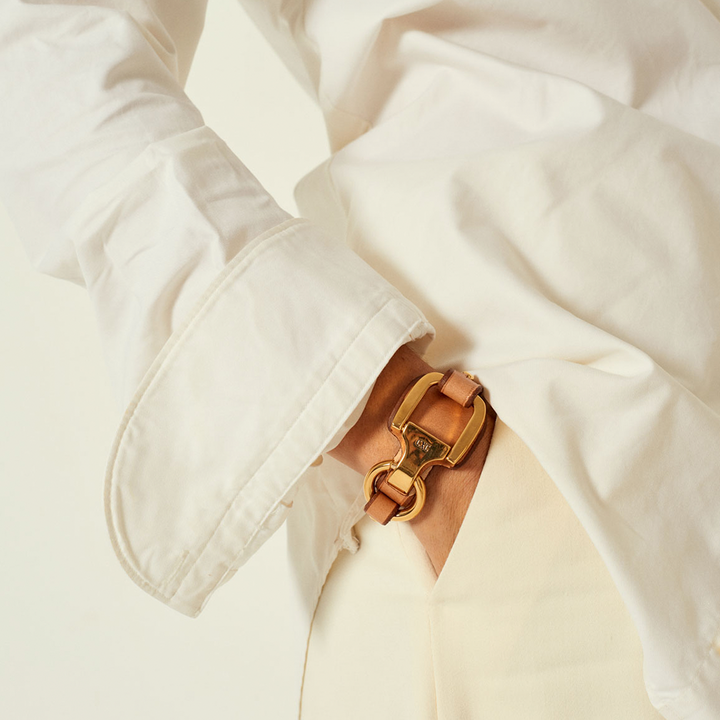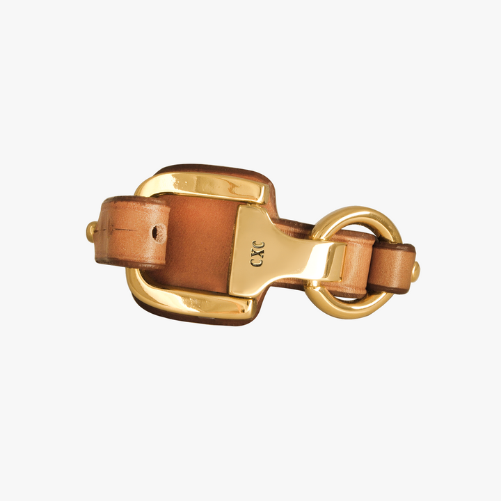 Pulsera con Cuero Camel, con canto matado a mano, teñido y lujado con fileteado. Aplique bañado en Oro. Talla: única y ajustable Para una muñeca de 14 a 16,5 cm aprox