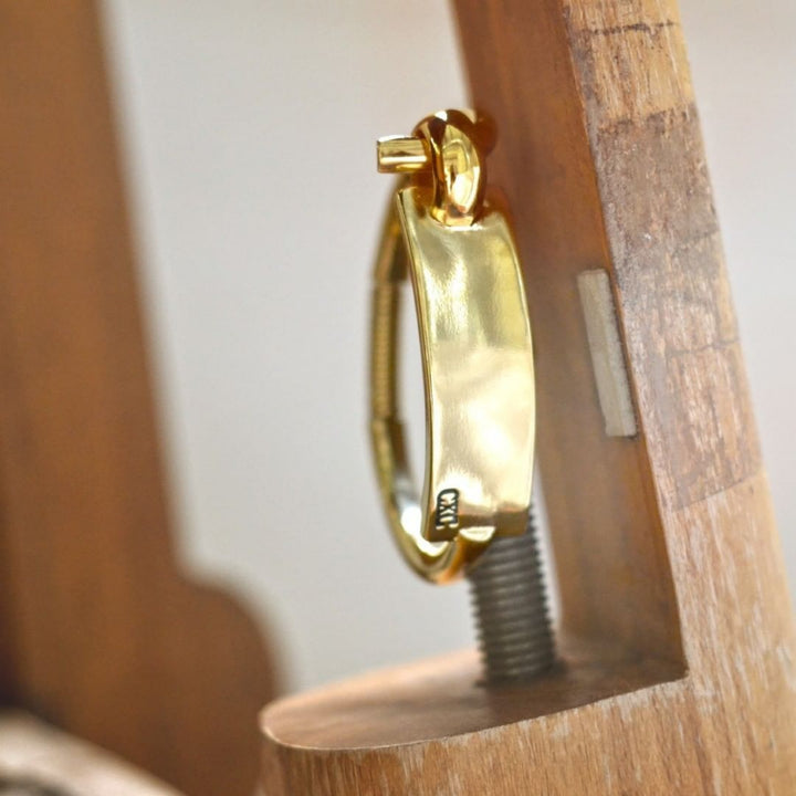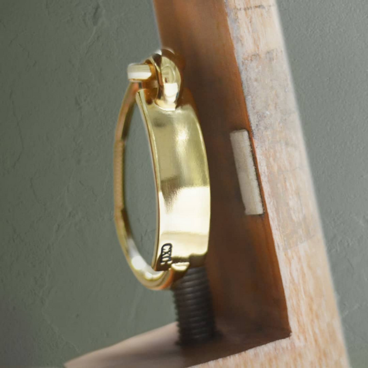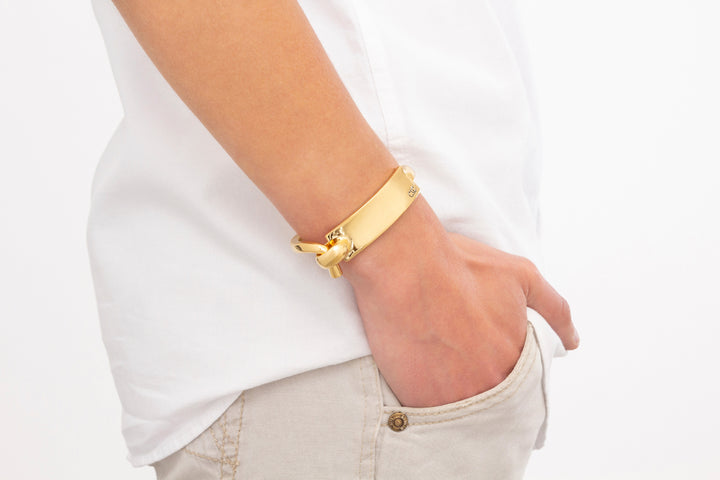La estética industrial se une a lo clásico en este brazalete rígido en forma de esclava. La pulsera está fabricada con una aleación de metales y bañada en oro. Mientras que el muelle es de hierro cobrizado.