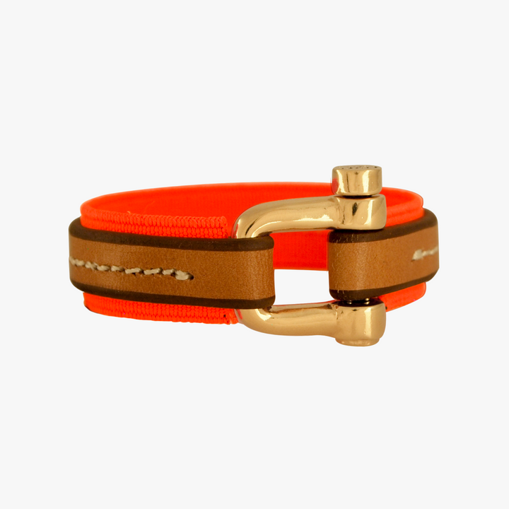 Pulsera formada por tira de goma color rojo y cuero camel con bordes tintados, la pulsera que debe llevarse muy ajustada. Cierre bañado en oro.