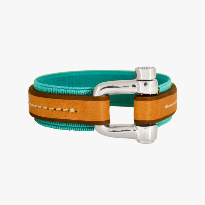 Pulsera formada por tira de goma color turqueza y cuero camel con bordes tintados, la pulsera que debe llevarse muy ajustada. Cierre bañado en Plata.