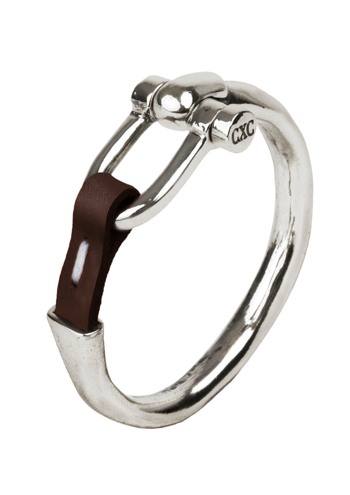 Pulsera casual y elegante en forma de grillete, fabricada con una aleación de metales y bañada en plata con detalle en cuero marrón. Diseño exclusivo de CXC, elaborado de manera artesanal en España.