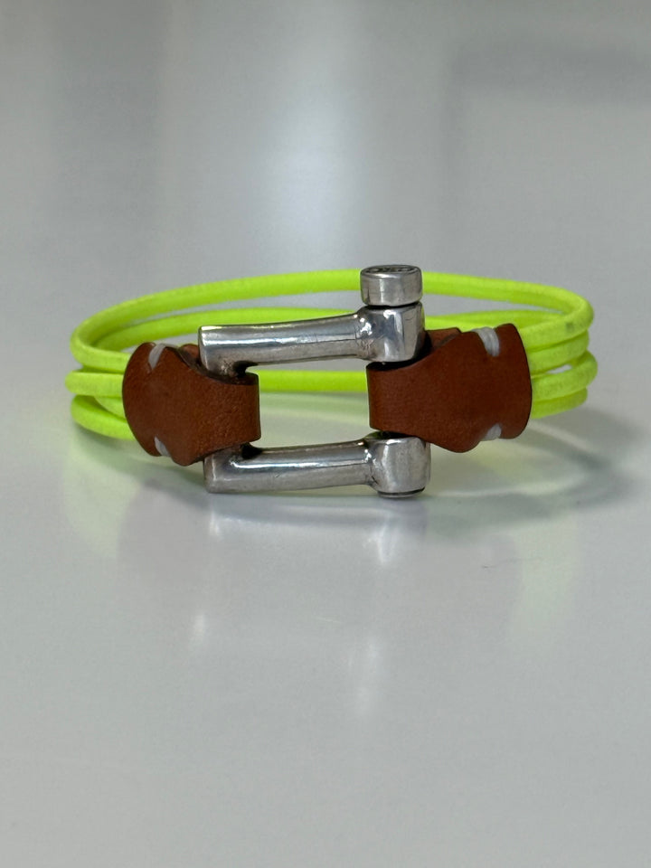 Pulsera formada por 4 cordones elásticos de 2,5 mm color amarillo. Terminales de cuero camel, cosidos con hilo encerado a mano y con cierre bañado en plata.
