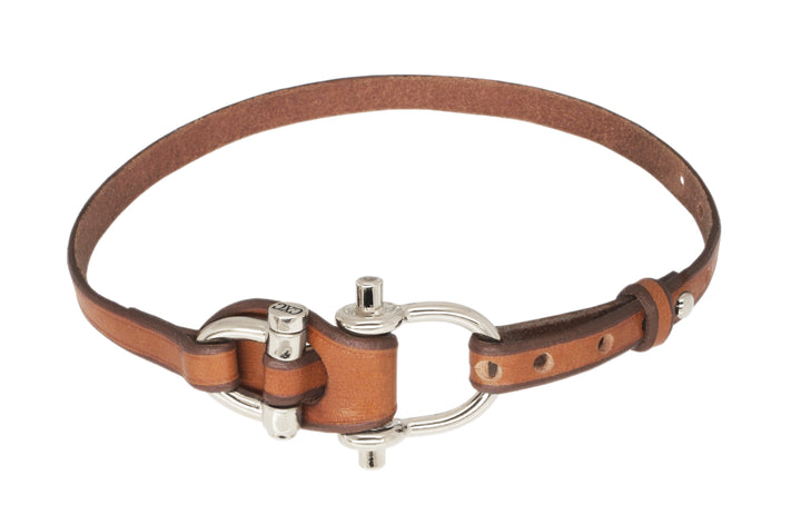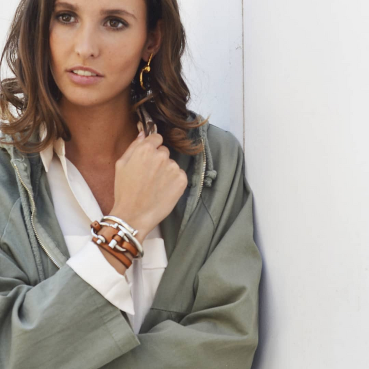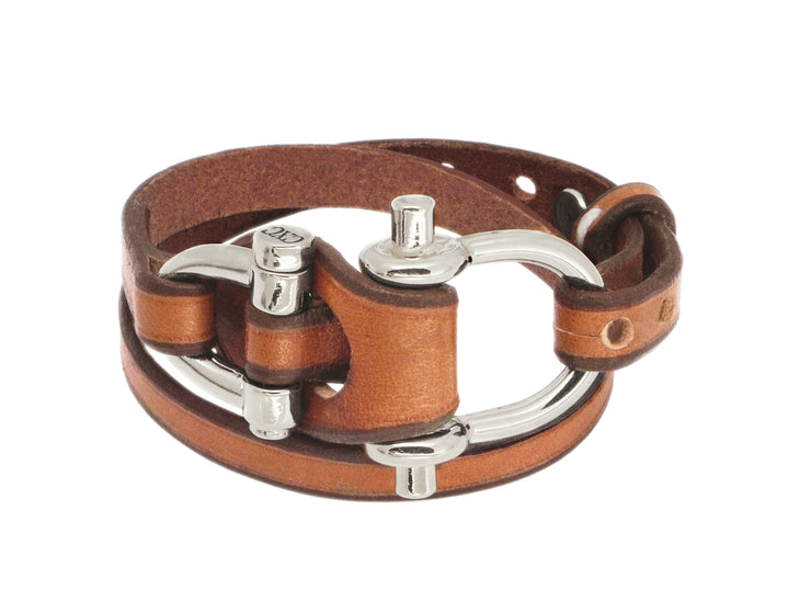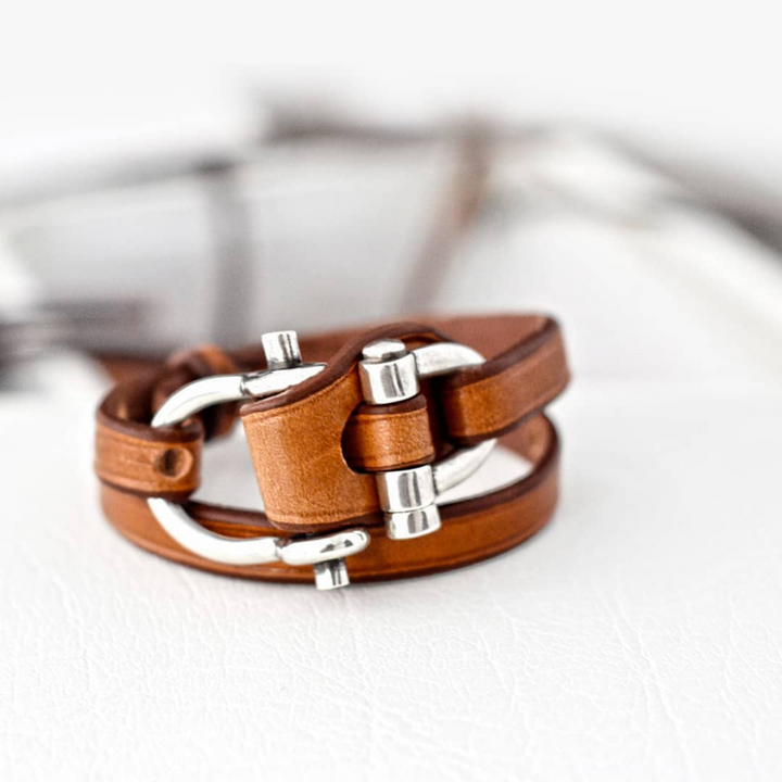 Pulsera de cuero camel con cierres bañados en Plata, con canto matado a mano, teñido y lujado. Talla única, para muñecas entre 15 a 18 cm.