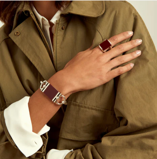 Pulsera bañada en Plata. Lleva una placa de metacrilato color Burdeos.