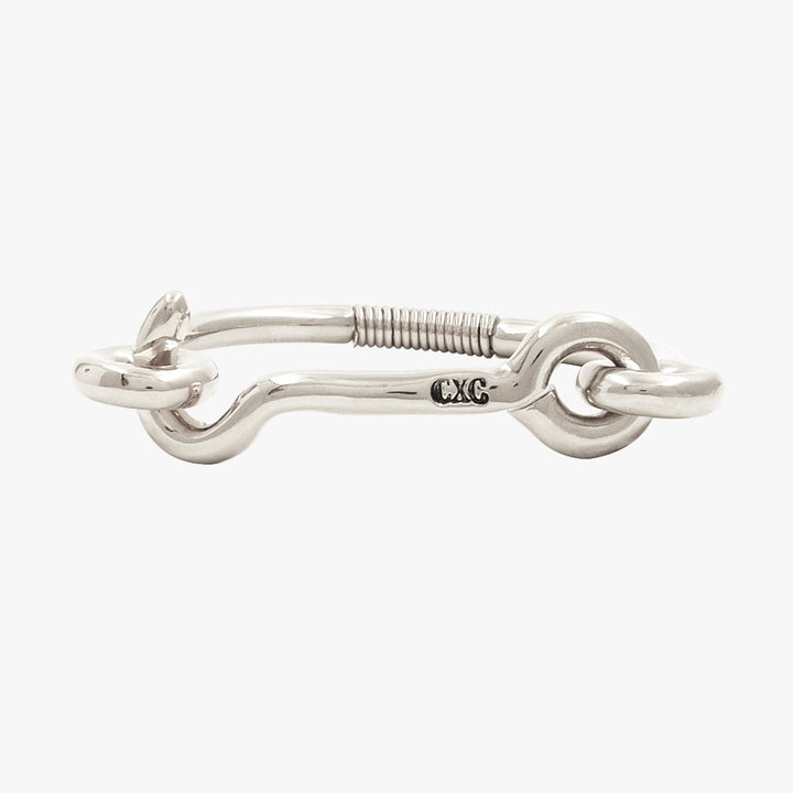 Brazalete con clara inspiración ferretera, una de las señas de identidad de CXC. La pulsera está hecha en aleaciones de metales y bañada en plata.