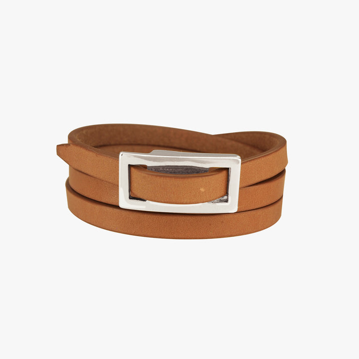 Esta pulsera en cuero color camel con original cierre fabricado con una aleación de metales en dos piezas y bañado en plata es un statement piece de la firma. Diseño exclusivo de CXC, elaborado de manera artesanal en España.