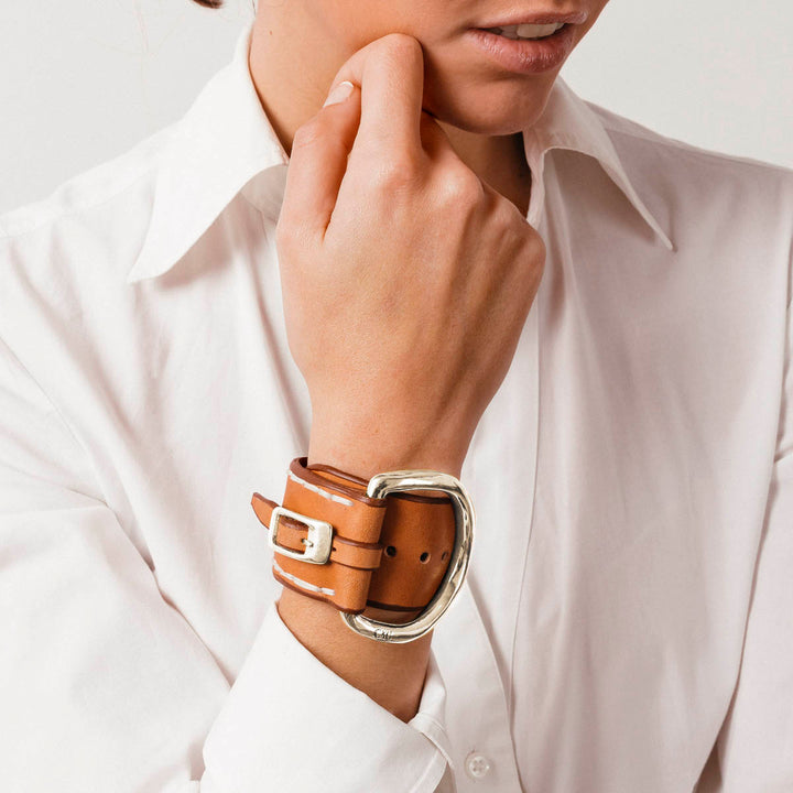 Pulsera Bañada en Plata y Cuero curtido vegetal con canto matado, teñido y cosido a mano. Esta pulsera de talla única y regulable, es recomendable para muñecas desde 14,5 cm a 19 cm.