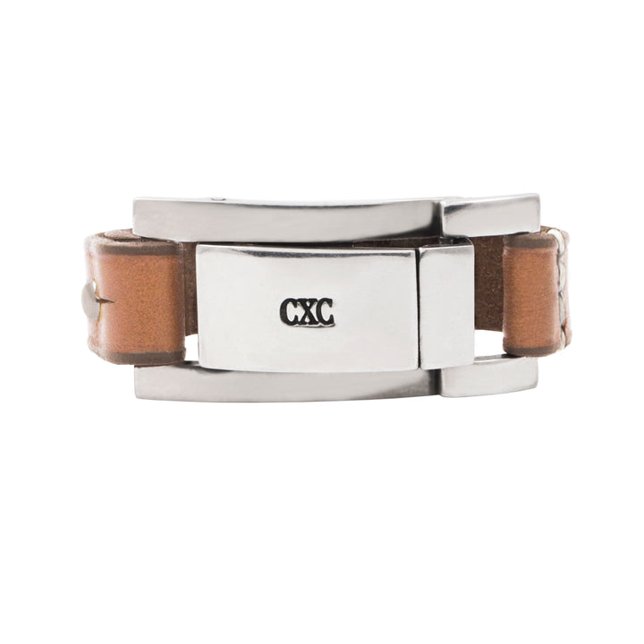 Para quienes aprecian un estilo atemporal pero original, CXC creó este brazalete de cuero camel y cierre en forma de cinturón. La hebilla está fabricada con una aleación de metales y bañada en plata.