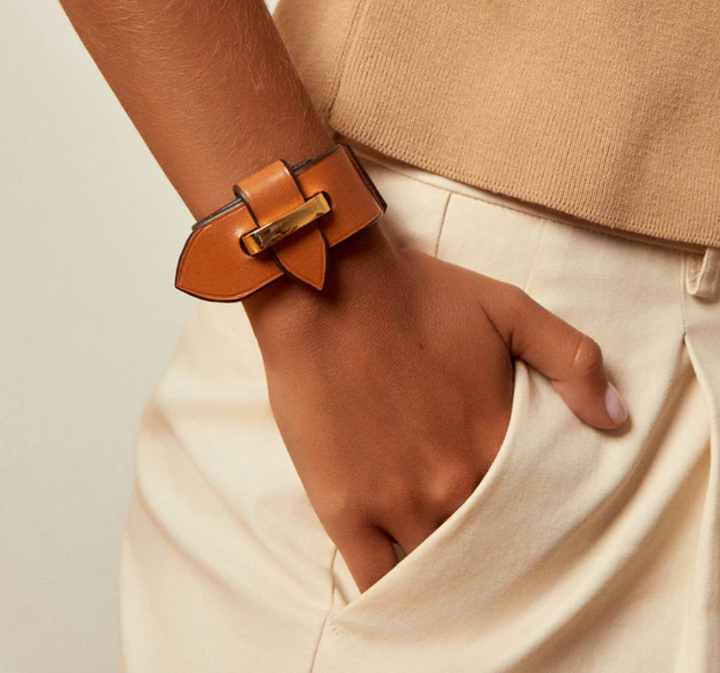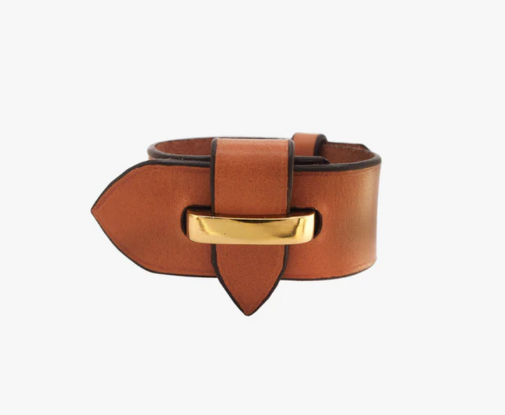 Materiales: Aleación de zinc y otros metales, cuero color camel, bañada en oro